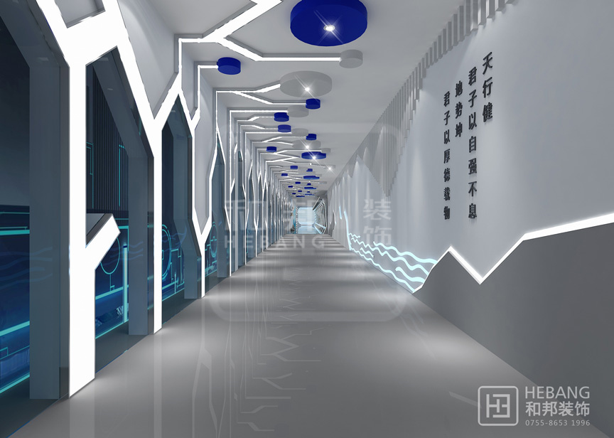 設計說明藍色貫穿于整個設計前后,讓人感覺干凈整潔。墻壁飾有的古代名言警句以及極富現代科技感的線條,行走在其中,像是穿越了古今,讓人流連往返。