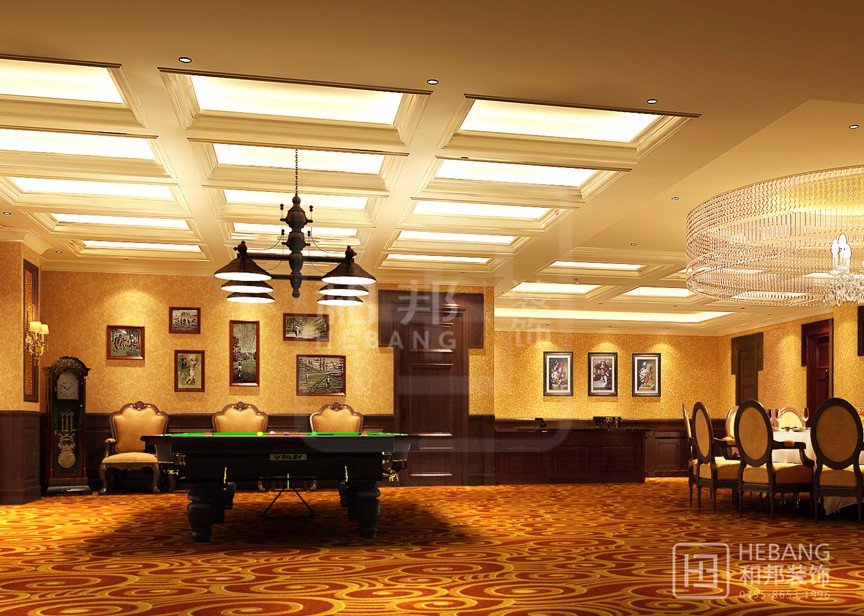 設計說明高端大氣的美式酒店。設計主要采用的是華麗的燈光裝飾設計,明亮閃耀的燈飾和漂亮的地毯一起作用于房間,好不愜意。