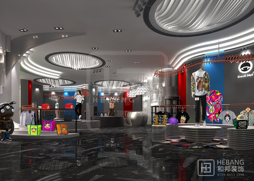 設計說明極具現代風格,豐富的色彩運用以及富有童趣的設計元素使整個賣場氛圍輕松、明快。創意十足的天花設計以及吸引眼球的墻面裝飾更能吸引消費者眼球。
