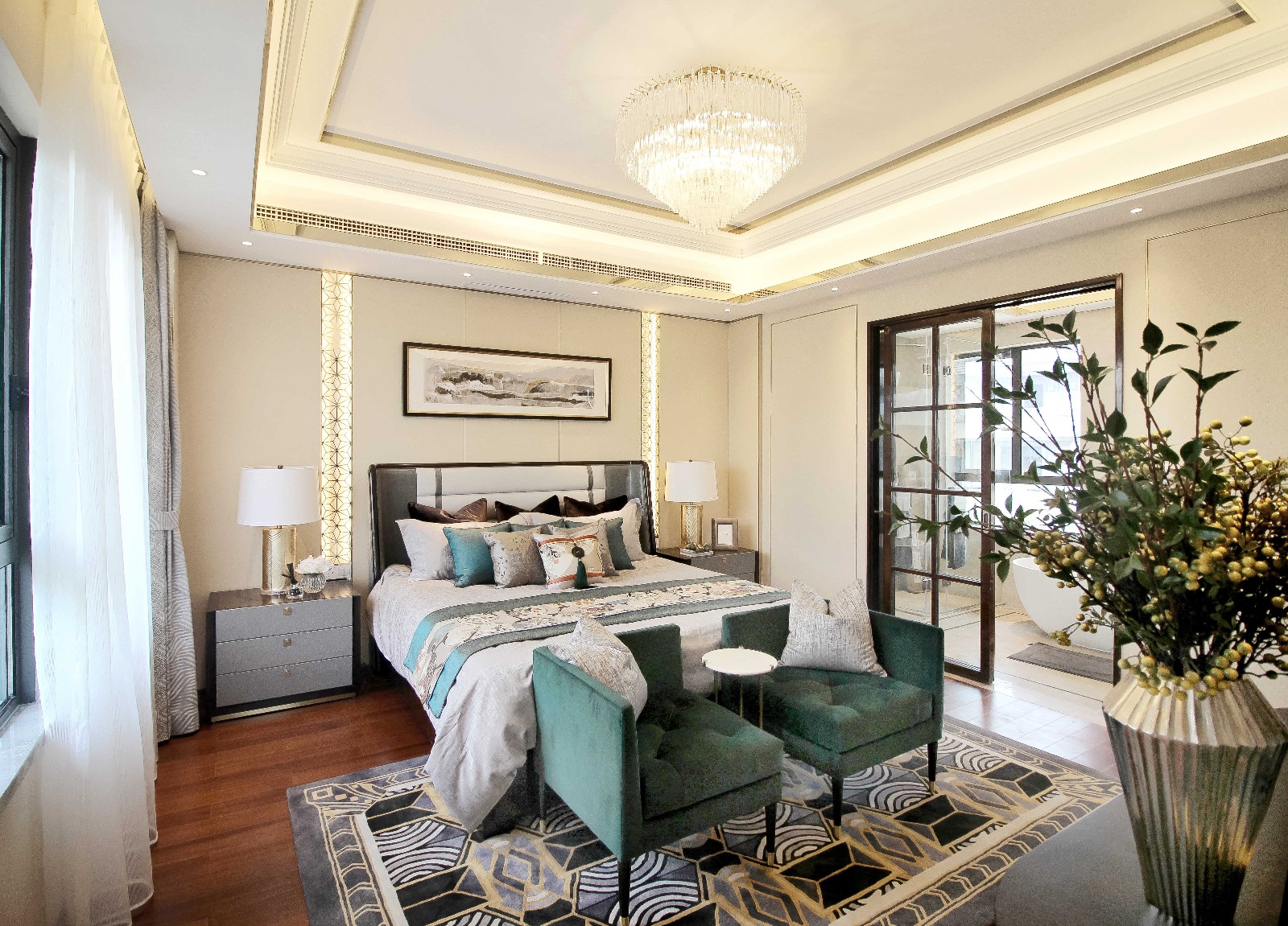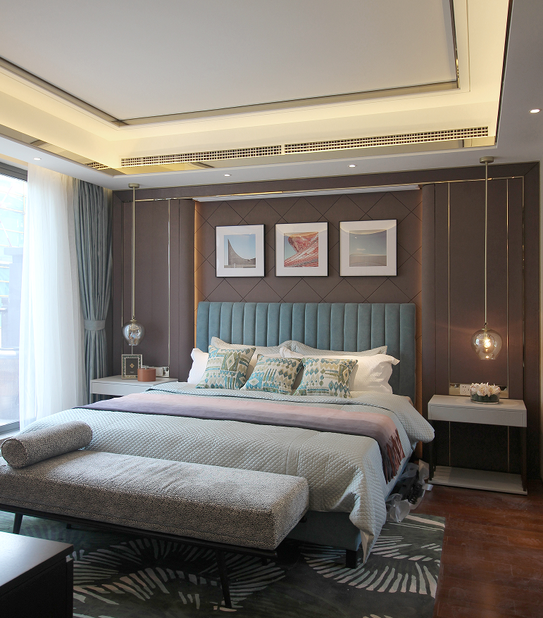 通過色彩的節奏變化,年輕感而又具有品質的主臥空間被呈現了出來。主臥空間內嵌獨立衣帽間及衛浴空間,提升了主人對于生活品質的追求。在吊頂等空間多處,柔和的圓角造型代替了棱角的尖銳,一抹金調的點綴、一撇綠植的協調,梳理出了偏女性化的空間之美。